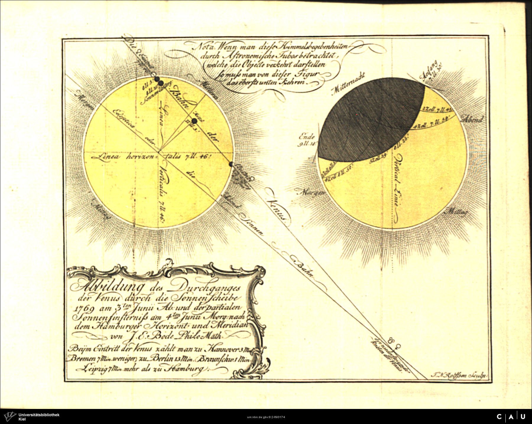 Abbildung des Durchganges der Venus durch die Sonnenscheibe 1769 am 3ten Junii Ab: und der partialen Sonnenfinsterniss am 4ten Junii Morg Bildquelle: Deutliche Abhandlung nebst einer allgemeinen Charte von dem bevorstehenden merkwürdigen Durchgang der Venus durch die Sonnenscheibe am 3ten Junii dieses 1769sten Jahrs, Bode, Johann Elert, 1769