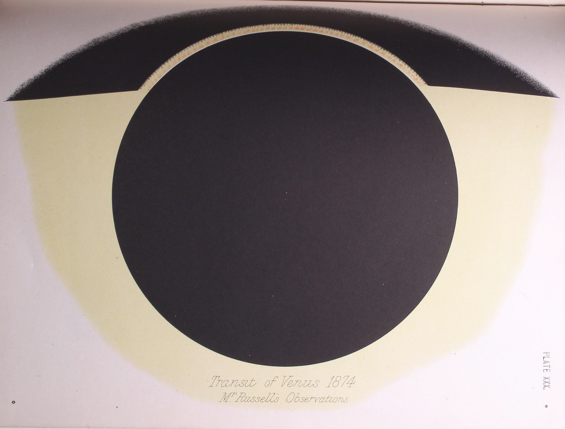 Der australische Astronom Henry Chamberlain Russell (1836 - 1907) publizierte 1892 sein Buch "Observations of the Transit of Venus 9th December 1874". Einige Illustrationen aus diesem Buch finden sie hier.
