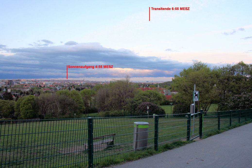 Da es sich beim 6. Juni um einen Werktag handelt (Mittwoch) ist die rechtzeitige Anreise mit öffentlichen Verkehrsmitteln bis Sonnenaufgang (4:55 Uhr MESZ) schwierig. Einzige Möglichkeit vor